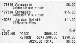 Here's a lucky punters ticket. So the odds were 7/1, 14/1, 10/1....therefore 7 x 14 x 10 = 980/1 implied odds of the multi. and $250 wagered.
