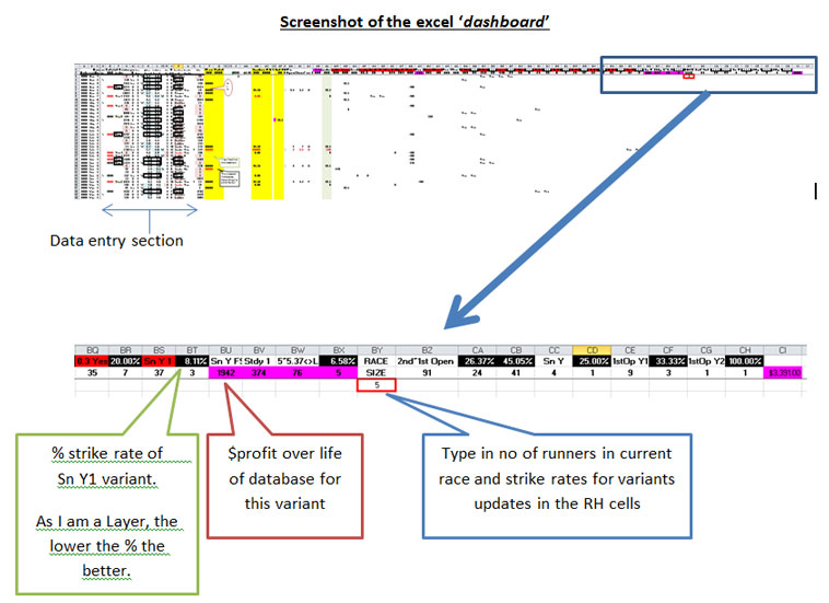 I call it my 'dashboard'. As I enter data on the current prices of potential selections these cells across the top row update and show me the % chance of winning (as in first past the post). As I'm a Layer, I'm looking for variants with the best optimised chance of losing.