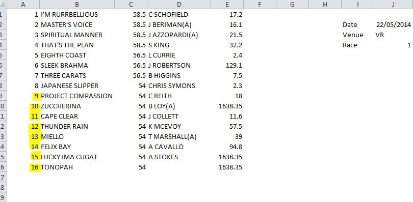 Morning Josh, the only hiccup with this one is that if the field size was greater on the previous race shown (Yesterday SR4) than todays VR1 then it still displays the overrun of horses from the previous race. See the jpg, horses 9 ~ 16 were from SR4 yesterday. Nearly there mate..... ![]() |